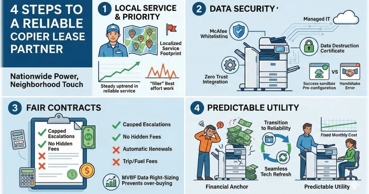 Four-step guide to a Reliable Copier Lease in Austin, covering local service footprints, Data Security, Fair Contracts, and Predictable Utility.